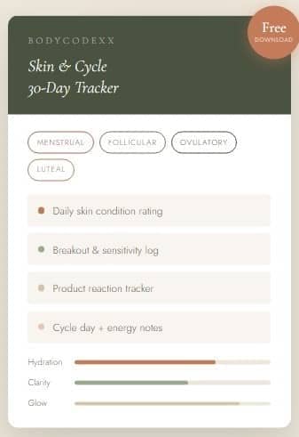 Most skin advice ignores the most important variable — your hormones. This tracker connects your daily skin to your cycle phase, so you can finally see the patterns driving your breakouts, dryness, and glow. No guessing. Just data.
